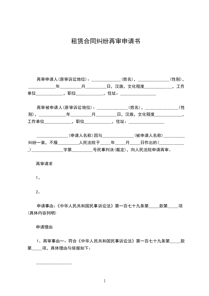 _______________(申请人名称)因与_______________(被申请人名称)__________纠纷一案,不服__________人民法院于_____年_____月_____日作出的(_____________)_______________字第__________号民事判决(裁定),向人民法院申请再审。