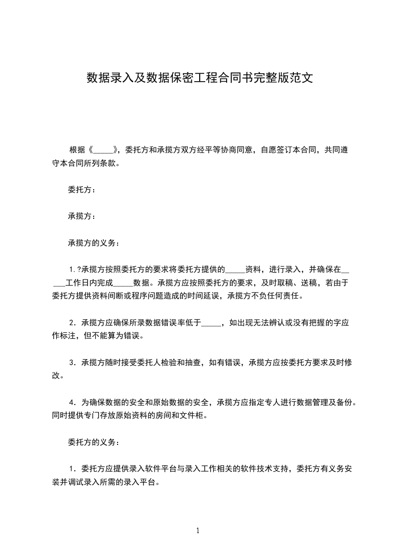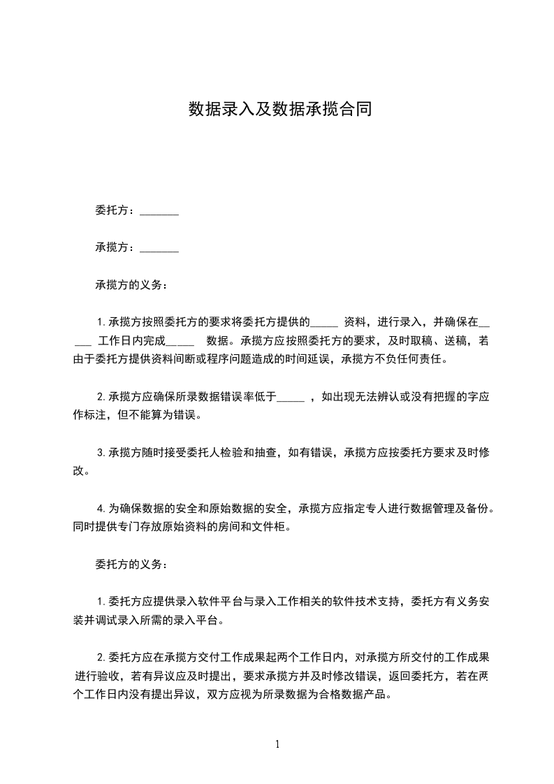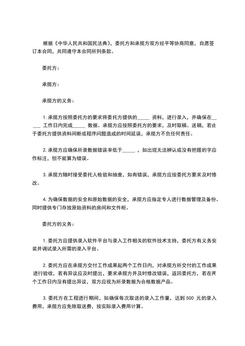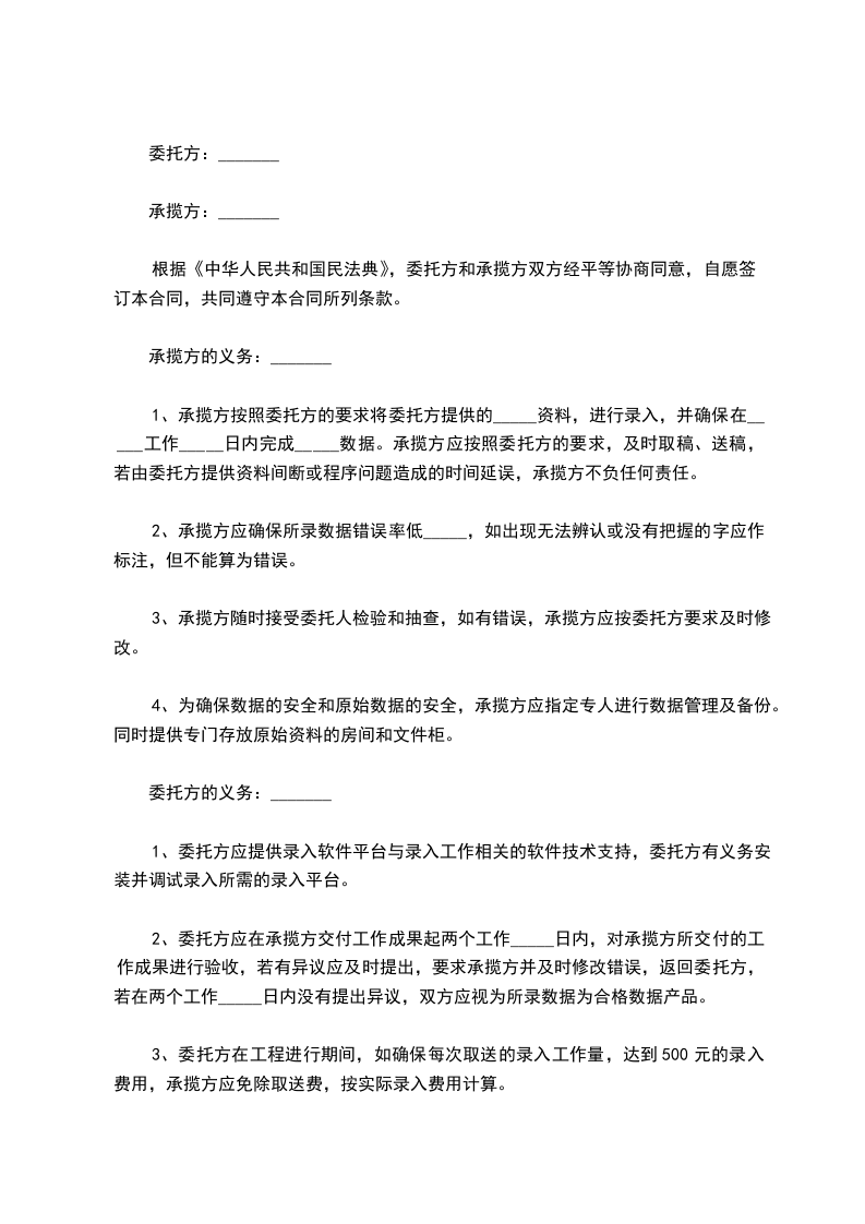 1.?承揽方按照委托方的要求将委托方提供的_____资料,进行录入,并确保在_____工作日内完成_____数据。承揽方应按照委托方的要求,及时取稿、送稿,若由于委托方提供资料间断或程序问题造成的时间延误,承揽方不负任何责任。