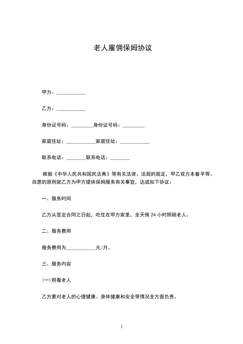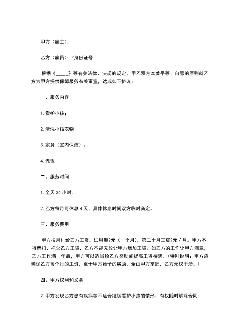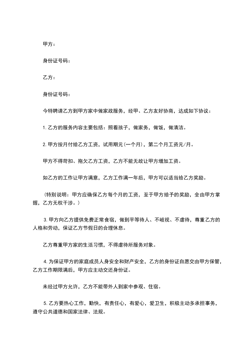 5.为保证甲方的家庭成员人身安全和财产安全,乙方的身份证自愿交由甲方保管,乙方工作期限满后,甲方应主动交还身份证。未经过甲方允许,乙方不能带外人到家中参观、住宿。
