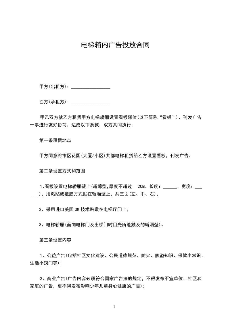 1、乙方可以安装装饰镜框用于刊登商业广告的范围为:小区楼宇内的部电梯的电梯厢。