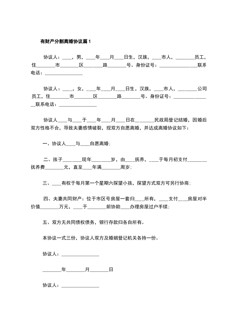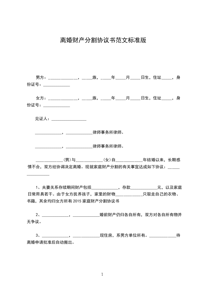 _____________(男)与_____________(女)自_____________年结婚以来,长期感情不合,双方经协调决定离婚。现就家庭财产分割的有关事宜达成如下协议:_________________