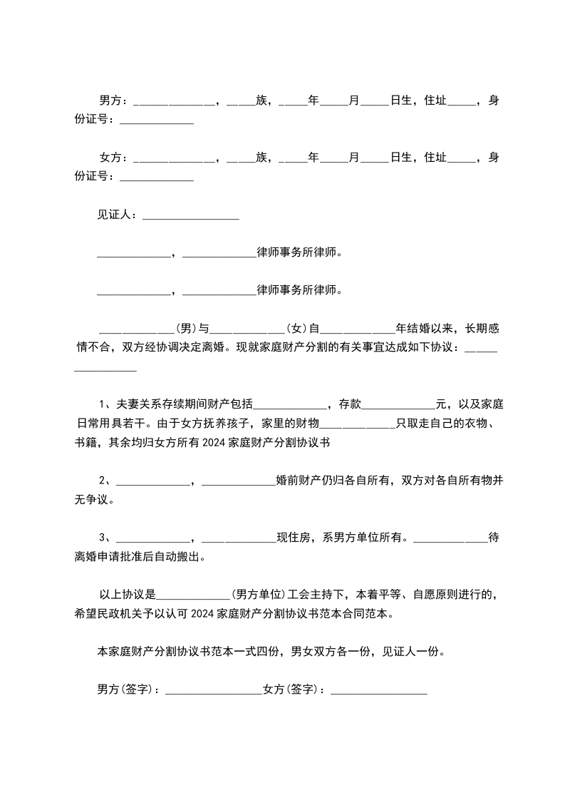 本家庭财产分割协议书范本一式四份,男女双方各一份,见证人一份。