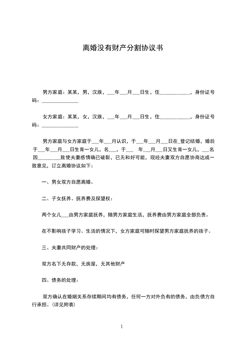 男方家庭与女方家庭于___年___月认识,于___年___月___日在_登记结婚,婚后于___年___月___日生育一女儿,名___,于___ 年___月___日又生育一女儿,___名。因_________致使夫妻感情确已破裂,已无和好可能,现经夫妻双方自愿协商达成一致意见,订立离婚协议如下: