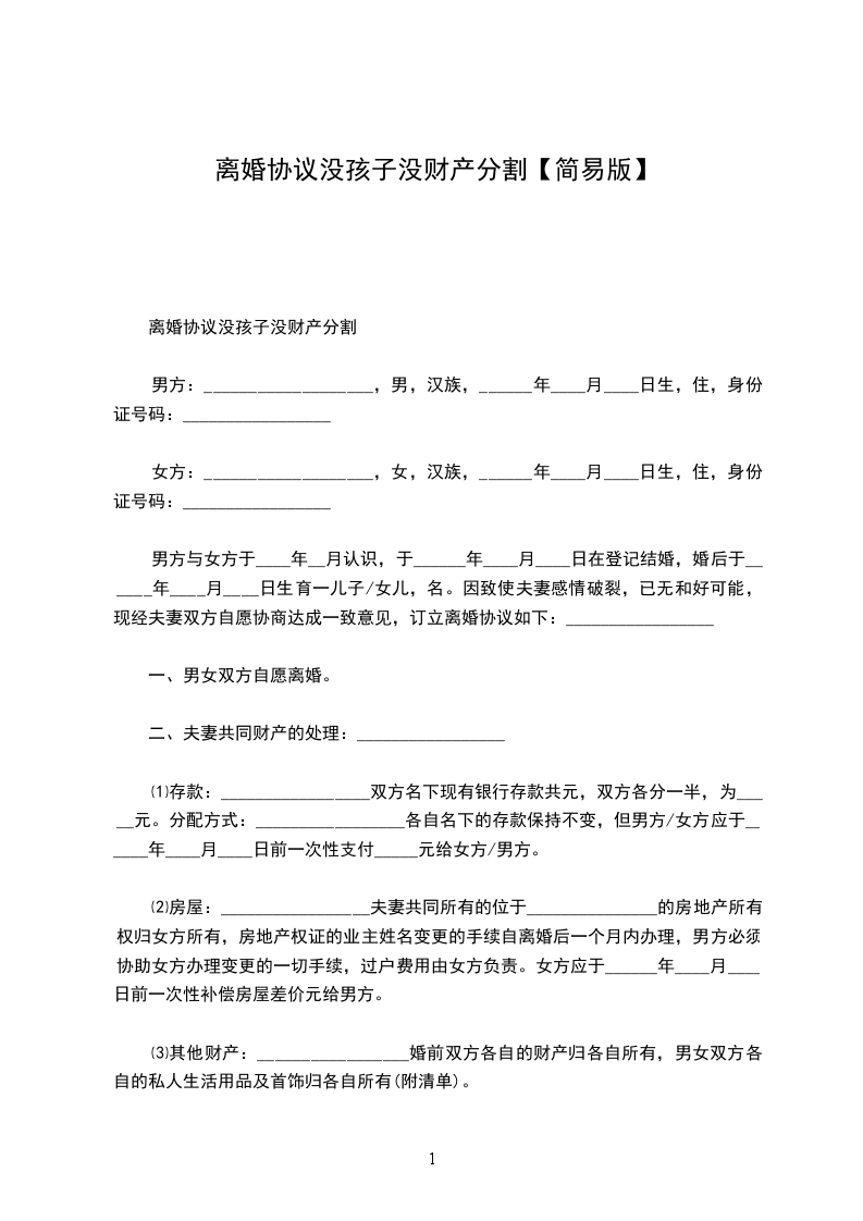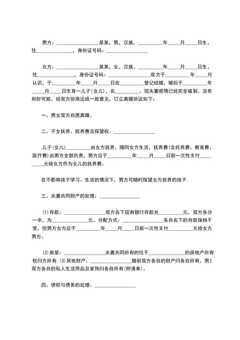 女方:_________________某某,女,汉族,__________年_____月_____日生,住_______________,身份证号码:_________________双方于__________年_____月认识,于__________年_____月_____日在__________登记结婚,婚后于__________年_____月_____日生育一儿子(女儿),名__________。现夫妻感情已经完全破裂,没有和好可能,经双方协商达成一致意见,订立离婚协议如下: