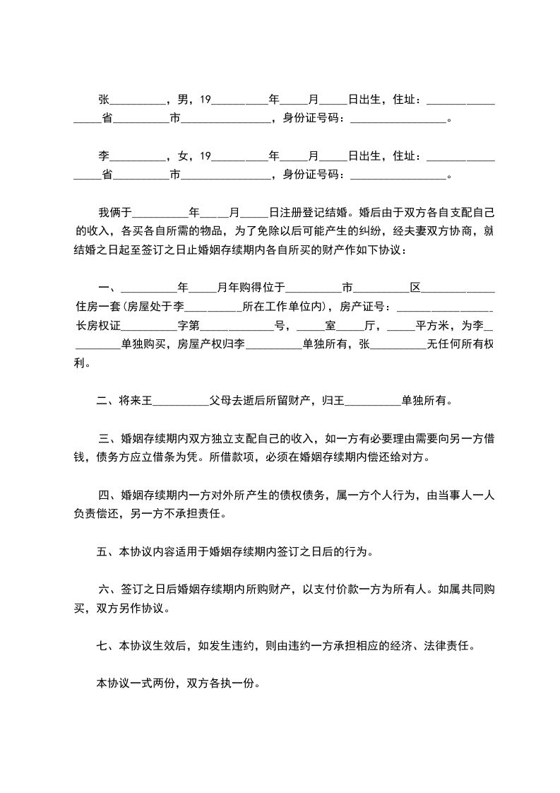 我俩于__________年_____月_____日注册登记结婚。婚后由于双方各自支配自己的收入,各买各自所需的物品,为了免除以后可能产生的纠纷,经夫妻双方协商,就结婚之日起至签订之日止婚姻存续期内各自所买的财产作如下协议: