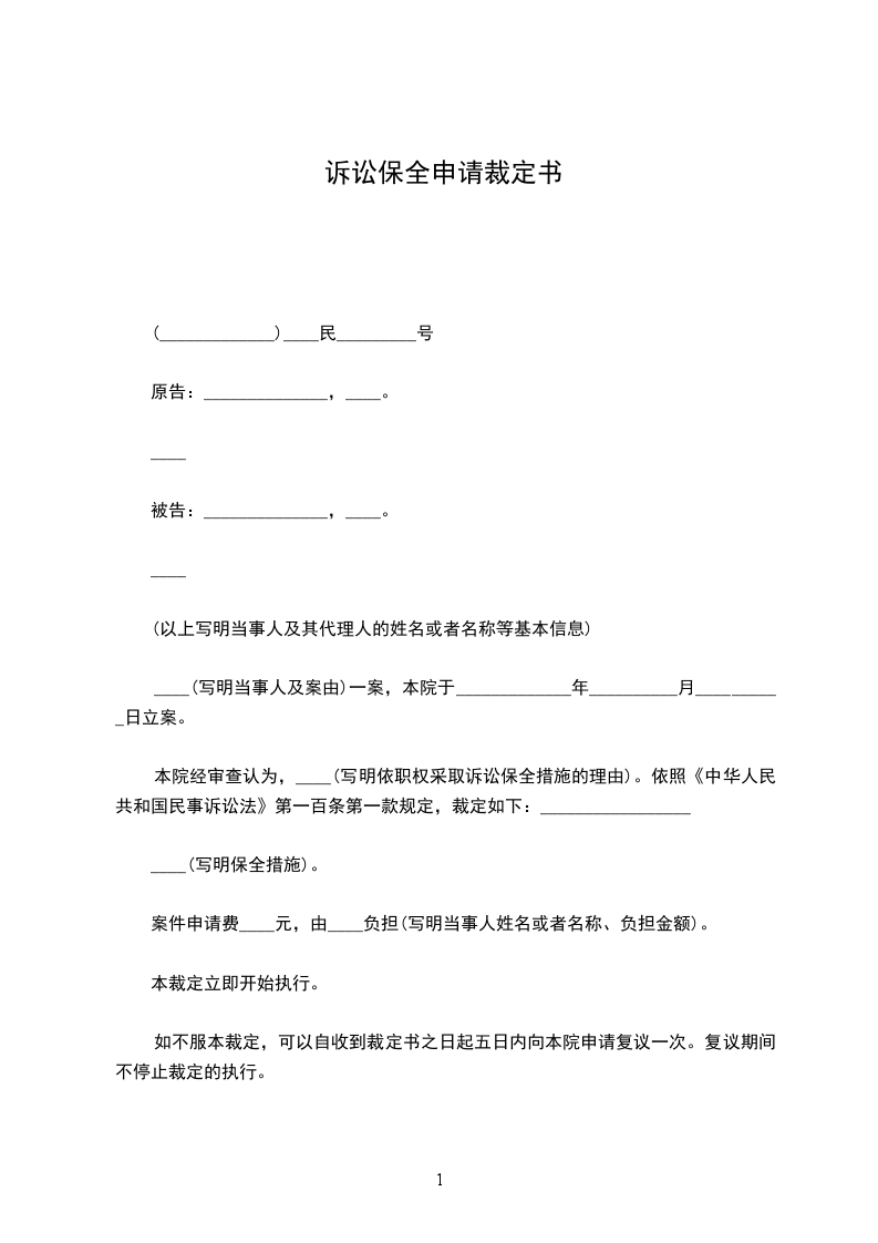 本院经审查认为,____(写明依职权采取诉讼保全措施的理由)。依照《中华人民共和国民事诉讼法》第一百条第一款规定,裁定如下:_________________