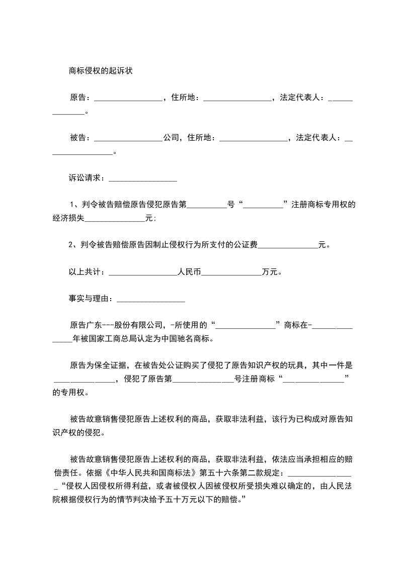 商标侵权的起诉状