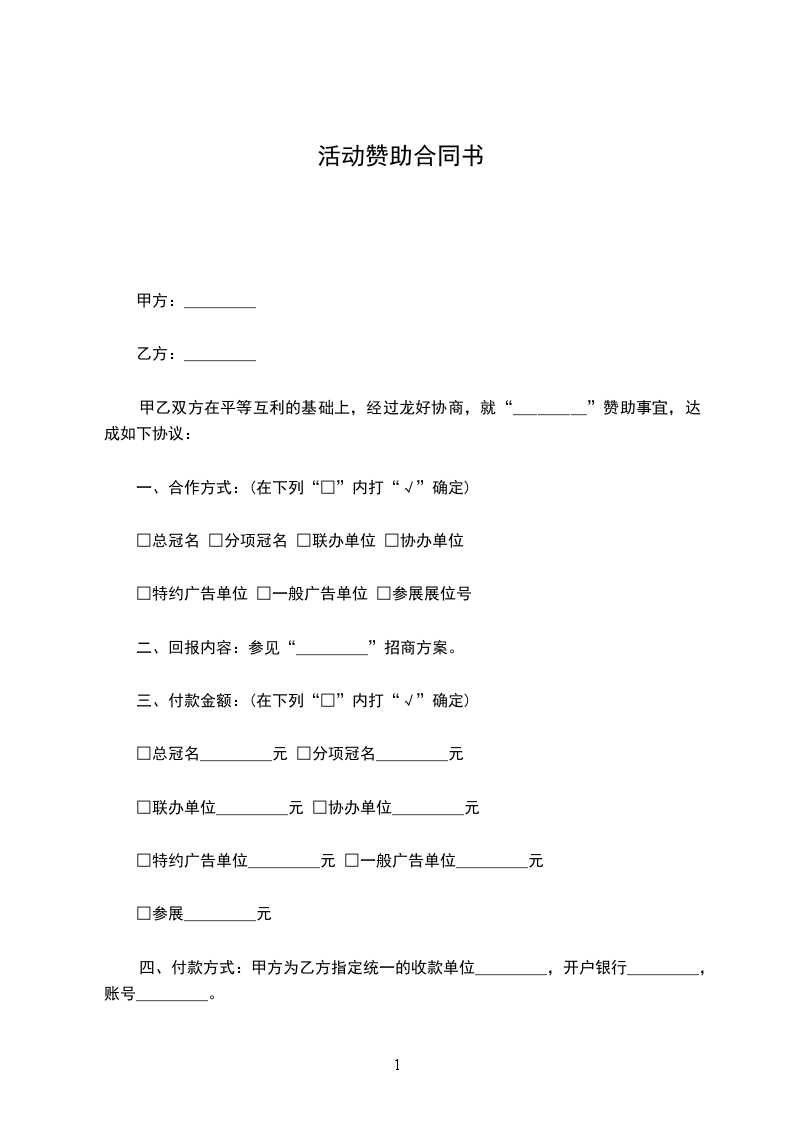 乙方:赞助费的支付,经双方商定,签定合同时以现金方式一次付清;