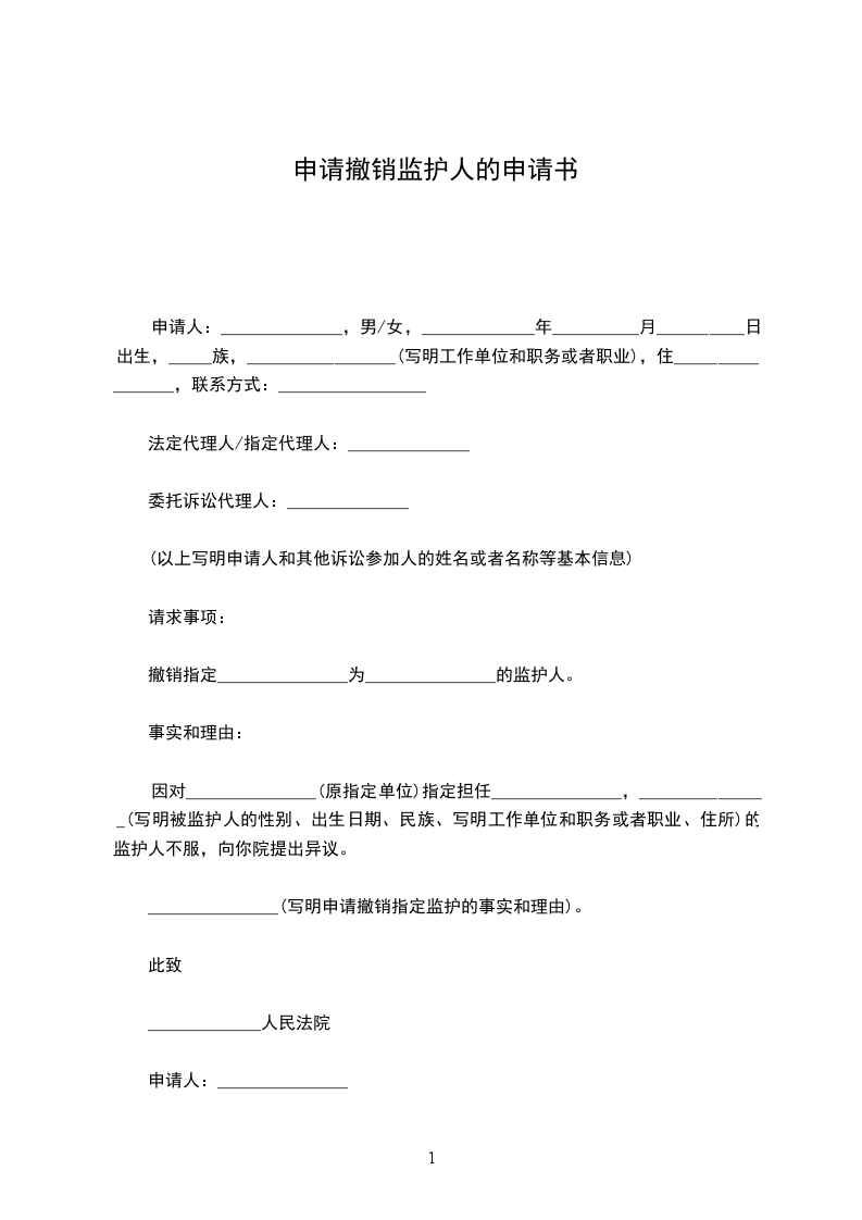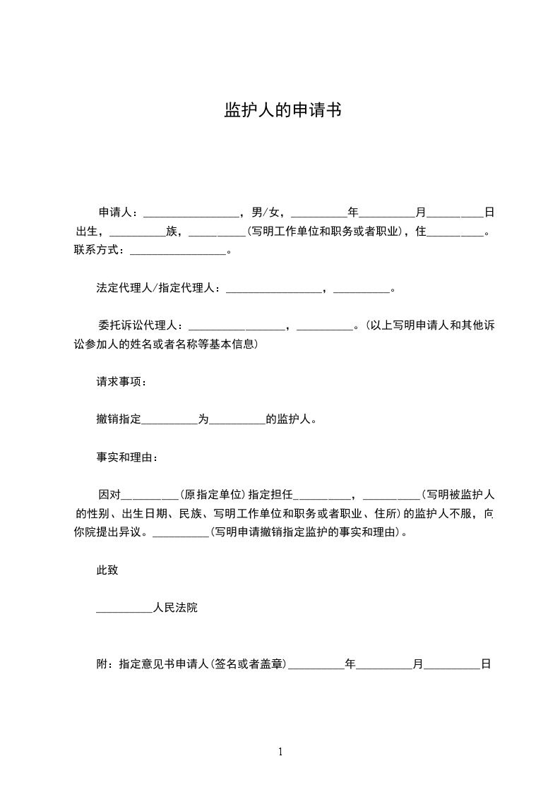 因对__________(原指定单位)指定担任__________,__________(写明被监护人的性别、出生日期、民族、写明工作单位和职务或者职业、住所)的监护人不服,向你院提出异议。__________(写明申请撤销指定监护的事实和理由)。