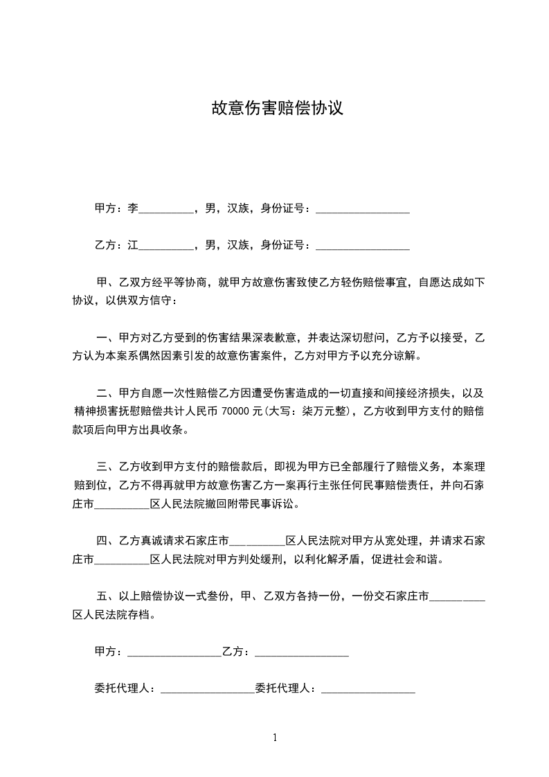 甲、乙双方经平等协商,就甲方故意伤害致使乙方轻伤赔偿事宜,自愿达成如下协议,以供双方信守: