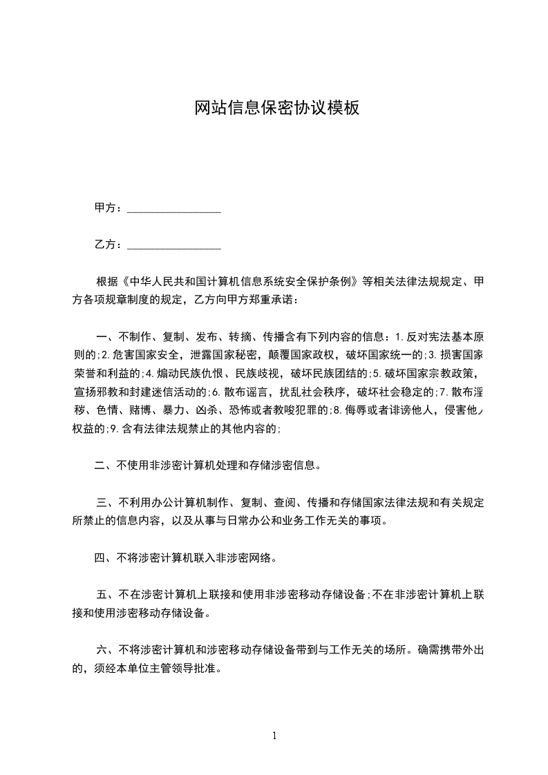 根据《中华人民共和国计算机信息系统安全保护条例》等相关法律法规规定、甲方各项规章制度的规定,乙方向甲方郑重承诺: