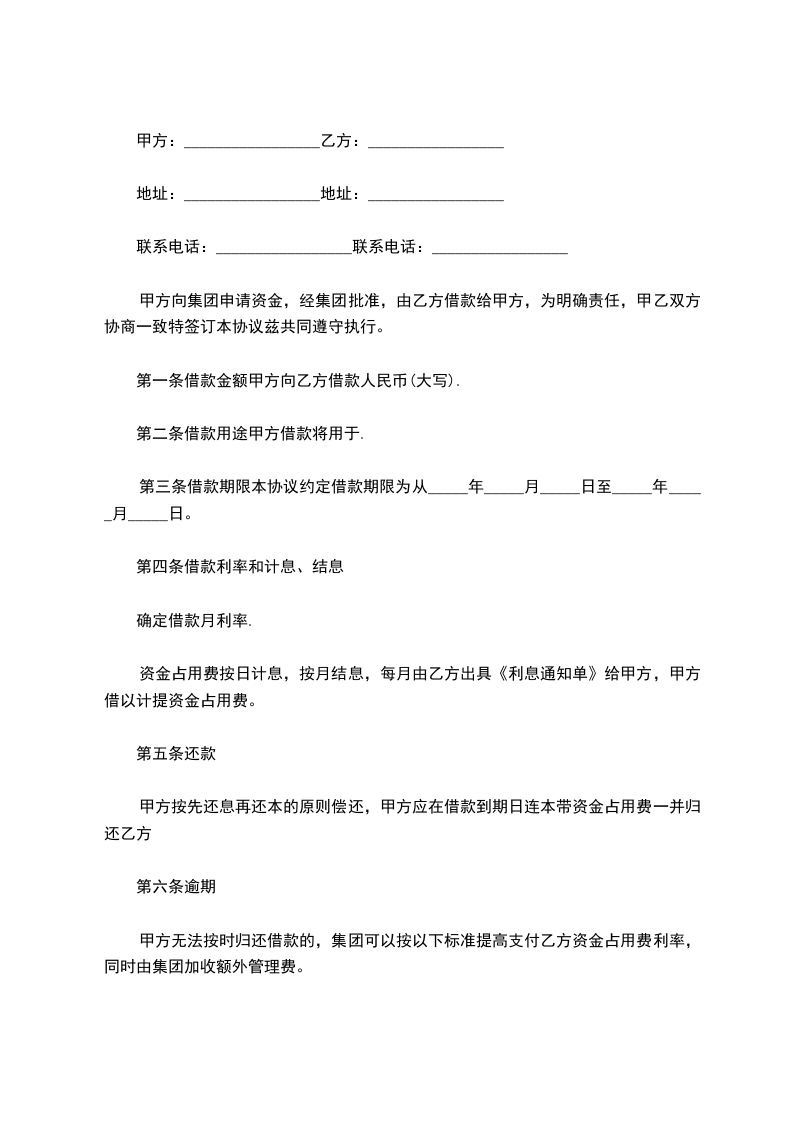 甲方向集团申请资金,经集团批准,由乙方借款给甲方,为明确责任,甲乙双方协商一致特签订本协议兹共同遵守执行。