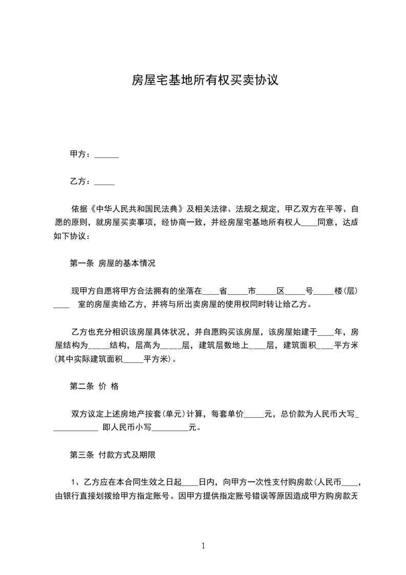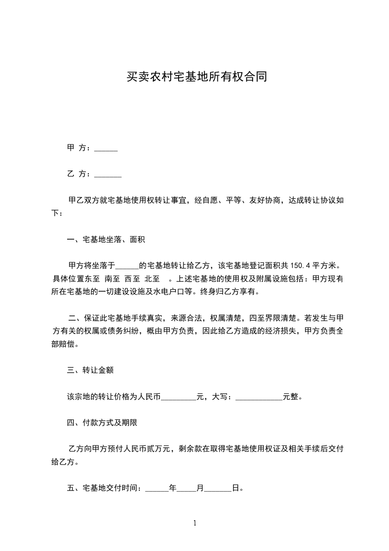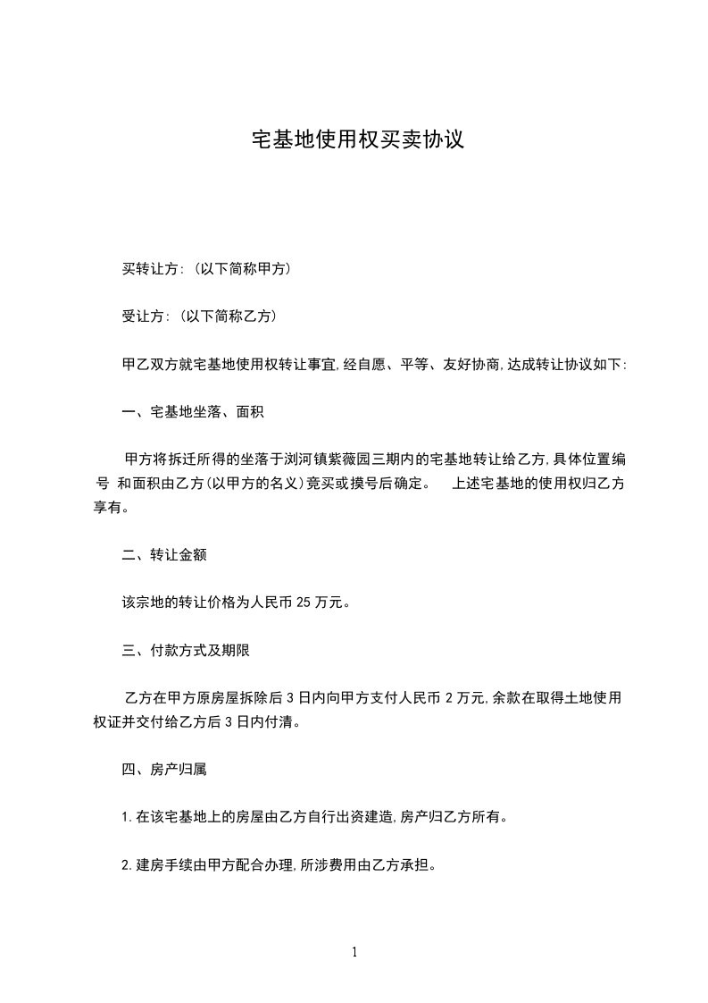 一、宅基地坐落、面积甲方将拆迁所得的坐落于__________的宅基地转让给乙方,具体位置编号和面积由乙方(以甲方的名义)竞买或摸号后确定。上述宅基地的使用权归乙方享有。