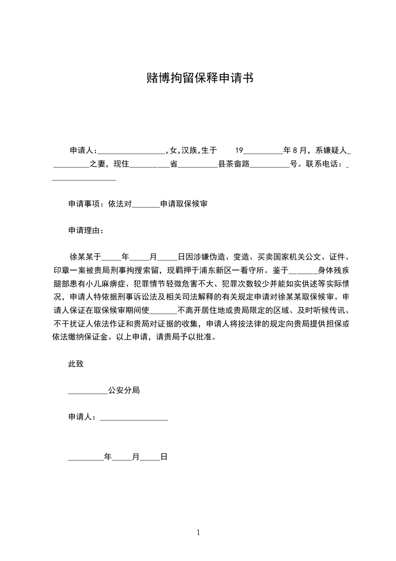 申请人:_________________,女,汉族,生于19__________年8月,系嫌疑人__________之妻,现住__________省__________县茶畲路__________号。联系电话:_________________