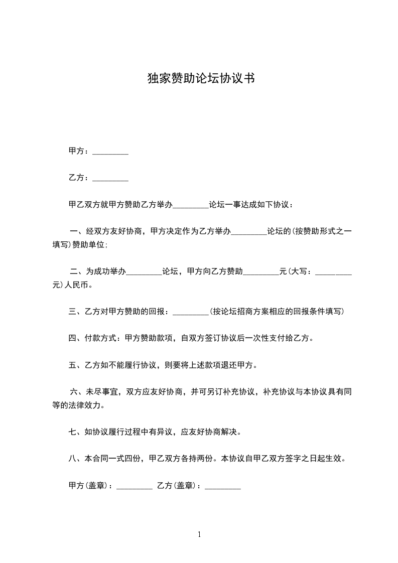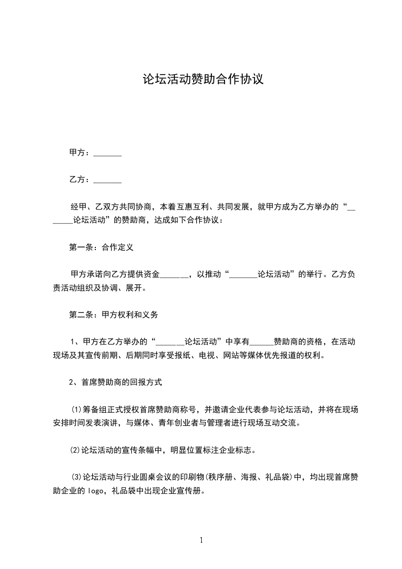 一、经双方友好协商,甲方决定作为乙方举办_________论坛的(按赞助形式之一填写)赞助单位;