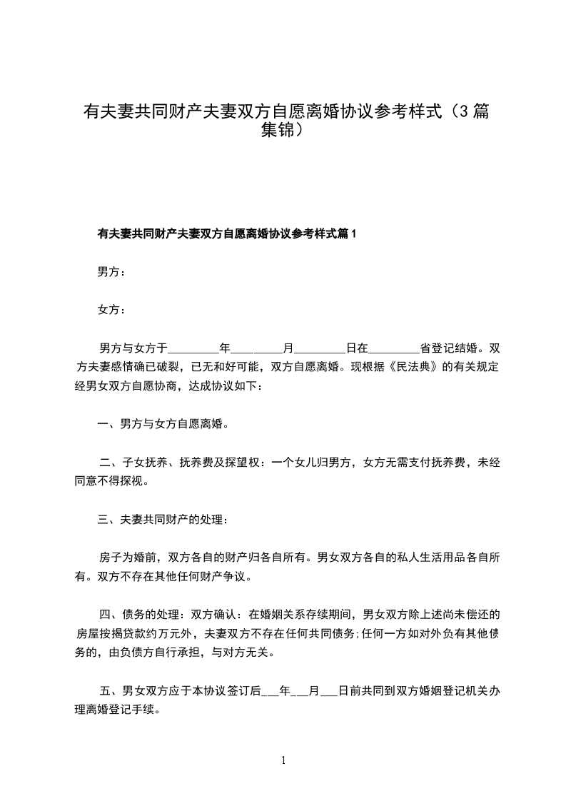 有夫妻共同财产双方协商离婚协议参考样板篇1
