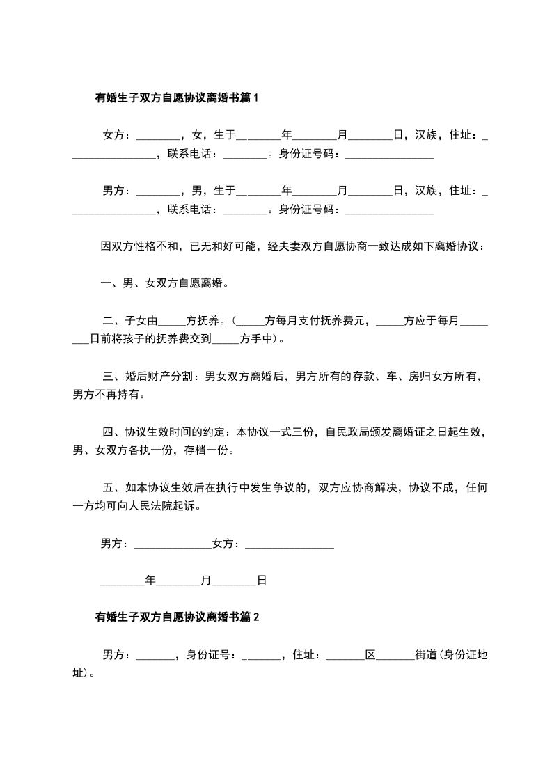 男女双方于_______年_______月_______日在_______民政局(办)办理结婚登记手续。_______年_______月_______日生育一子(女)_______(身份证号:______________)。因协议人双方性格不合,夫妻感情破裂,无法继续共同生活,已无和好可能。现双方就自愿离婚一事达成如下协议: