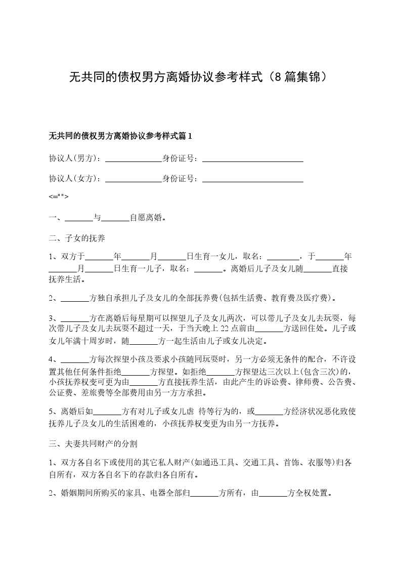 无共同债权债务男方协议离婚范本参考样板篇8
