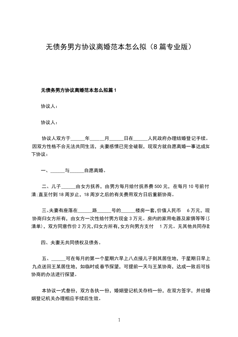 一、男方__与女方__自愿解除婚姻关系,双方自愿签订本离婚协议。孩子归男方,女方无需支付抚养费。