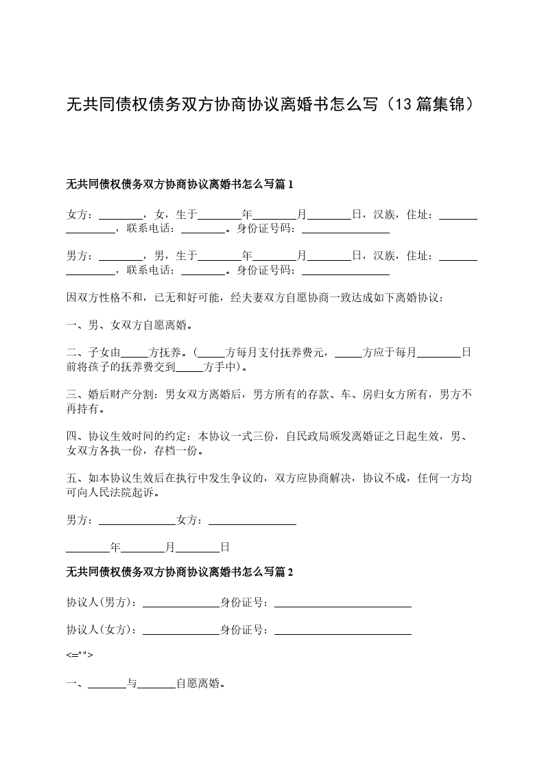 无共同债权债务双方协商离婚协议怎么写篇13
