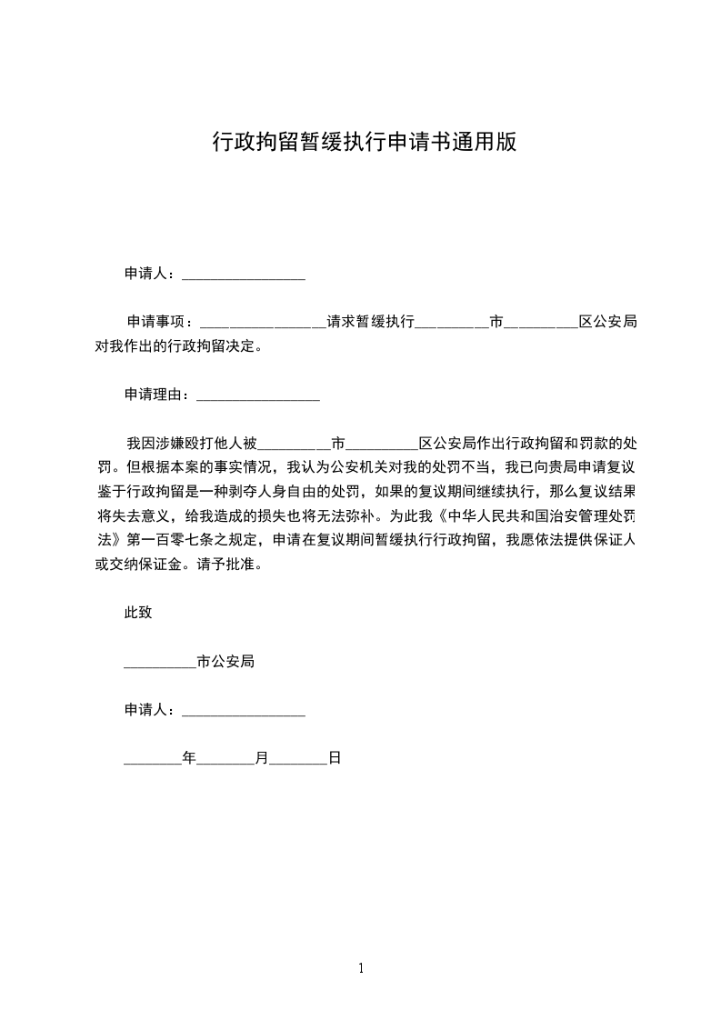 申请事项:_________________请求暂缓执行__________市__________区公安局对我作出的行政拘留决定。