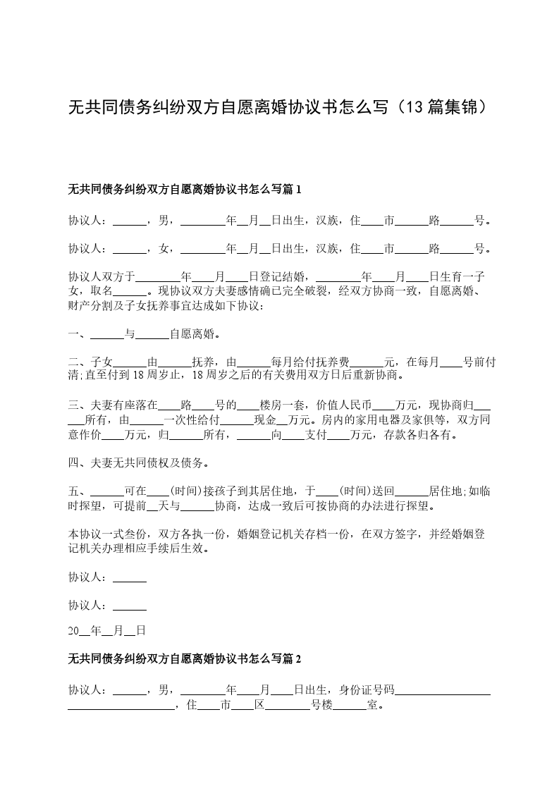 无共同债务纠纷双方自愿离婚协议书怎么写篇13
