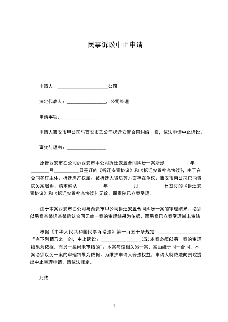 申请人西安市甲公司与西安市乙公司拆迁安置合同纠纷一案,依法申请中止诉讼。