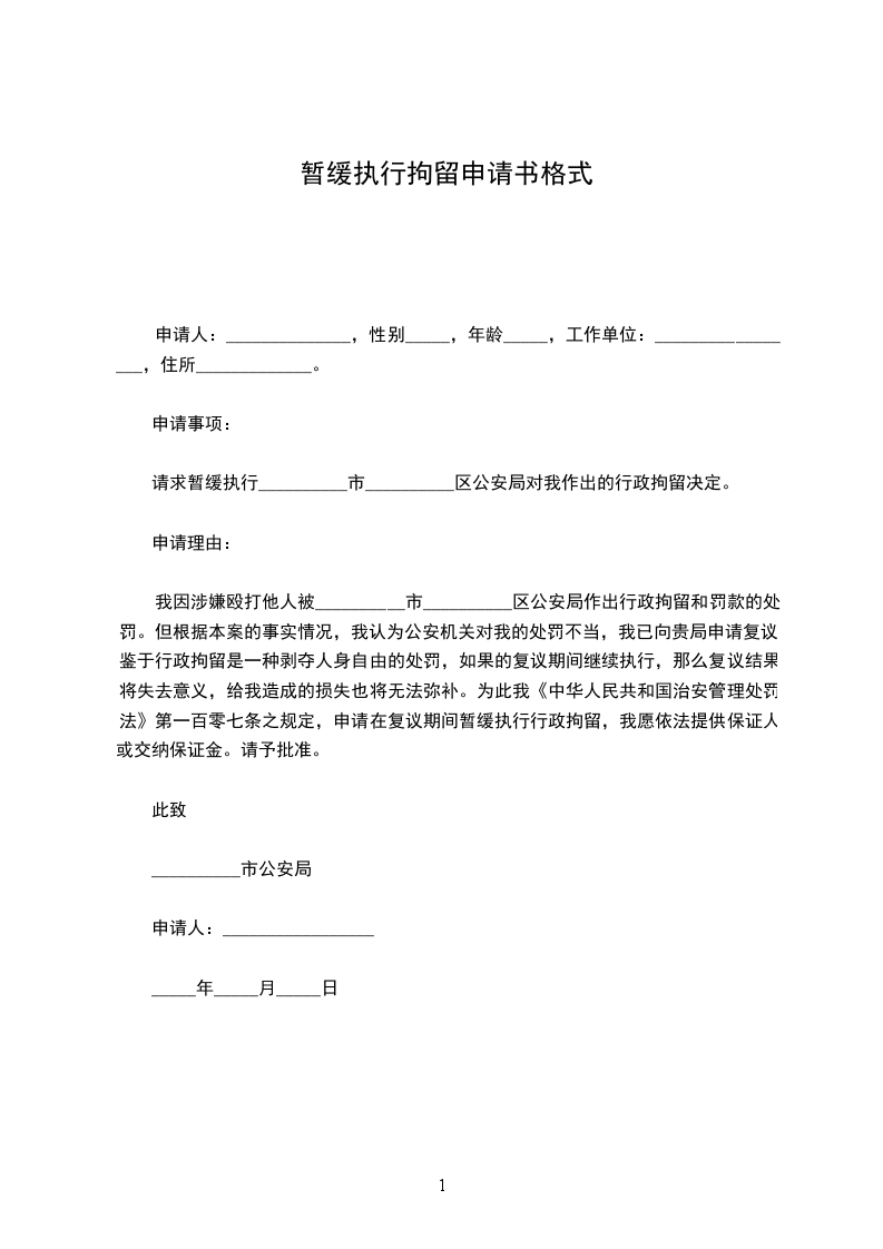 请求暂缓执行__________市__________区公安局对我作出的行政拘留决定。