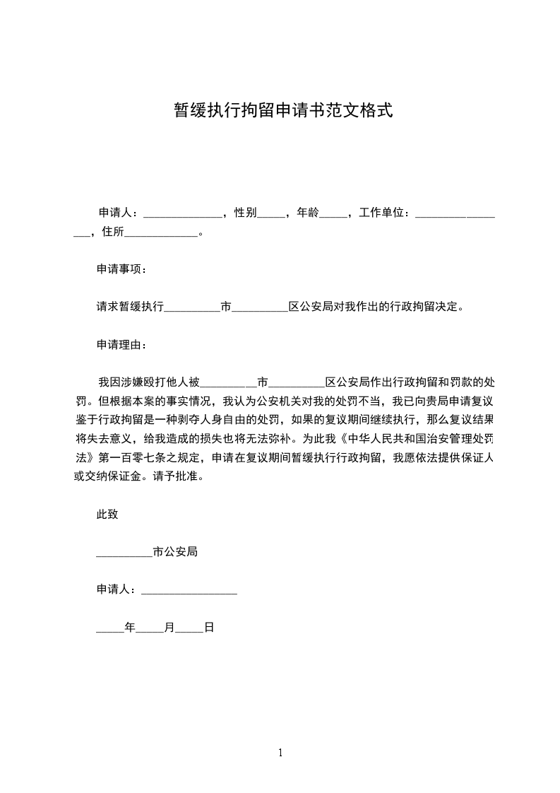 请求暂缓执行__________市__________区公安局对我作出的行政拘留决定。