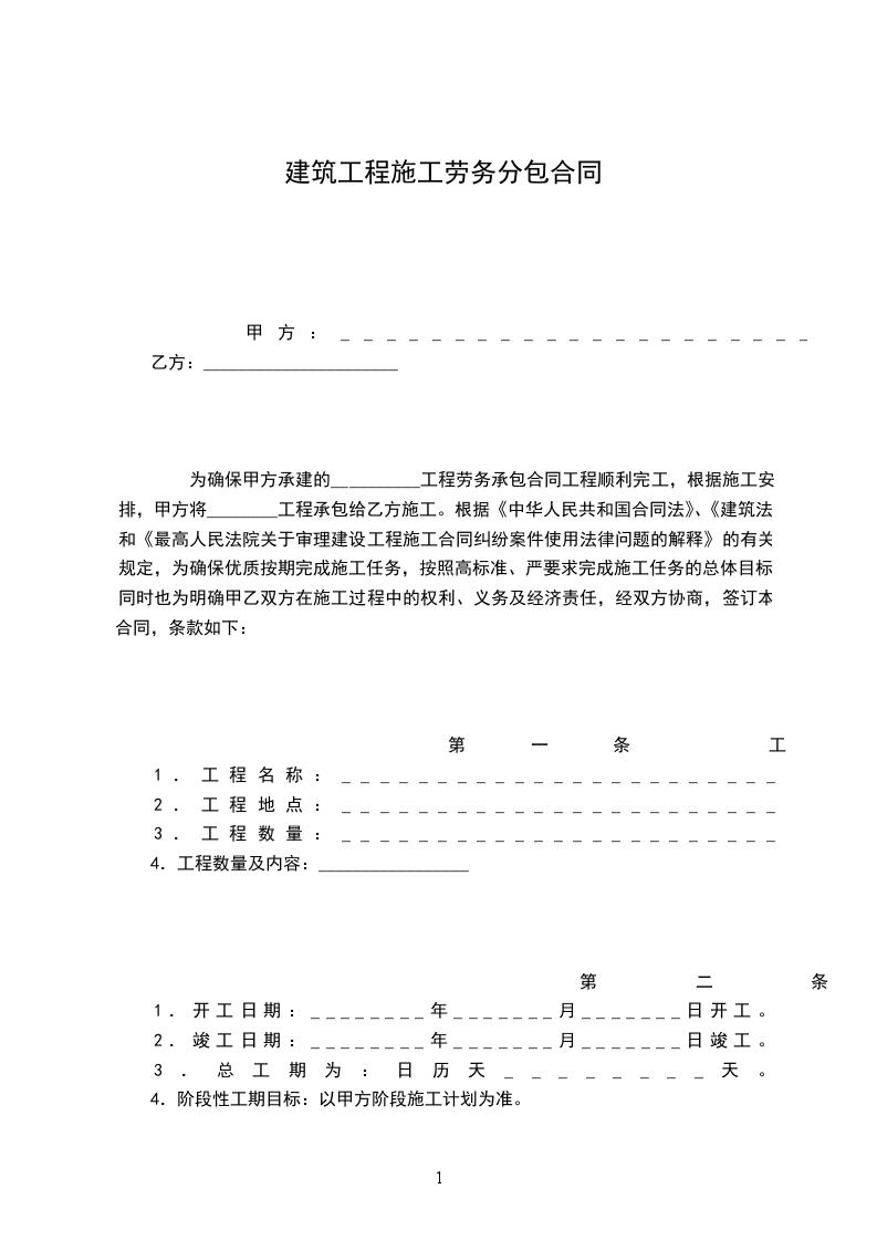 为确保甲方承建的__________工程劳务承包合同工程顺利完工,根据施工安排,甲方将________工程承包给乙方施工。根据《中华人民共和国民法典》、《建筑法》和《最高人民法院关于审理建设工程施工合同纠纷案件使用法律问题的解释》的有关规定,为确保优质按期完成施工任务,按照高标准、严要求完成施工任务的总体目标,同时也为明确甲乙双方在施工过程中的权利、义务及经济责任,经双方协商,签订本合同,条款如下:
