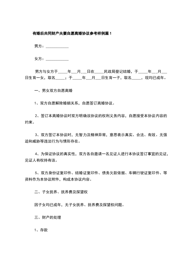 有婚后共同财产夫妻自愿离婚协议参考样例篇1