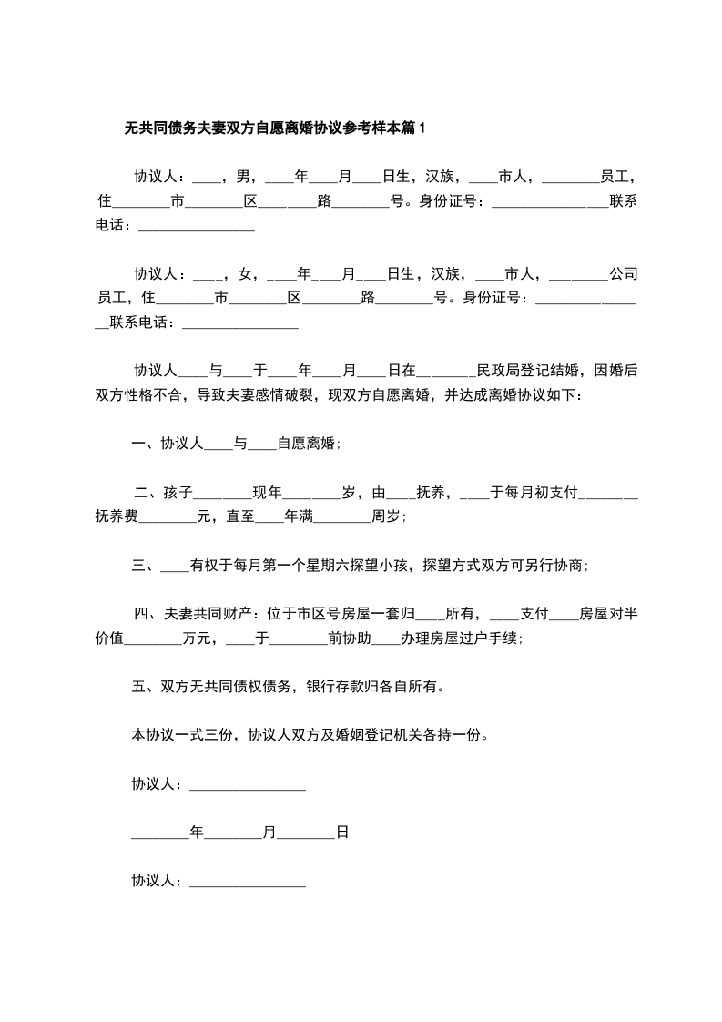 无共同债务夫妻双方自愿离婚协议参考样本篇1