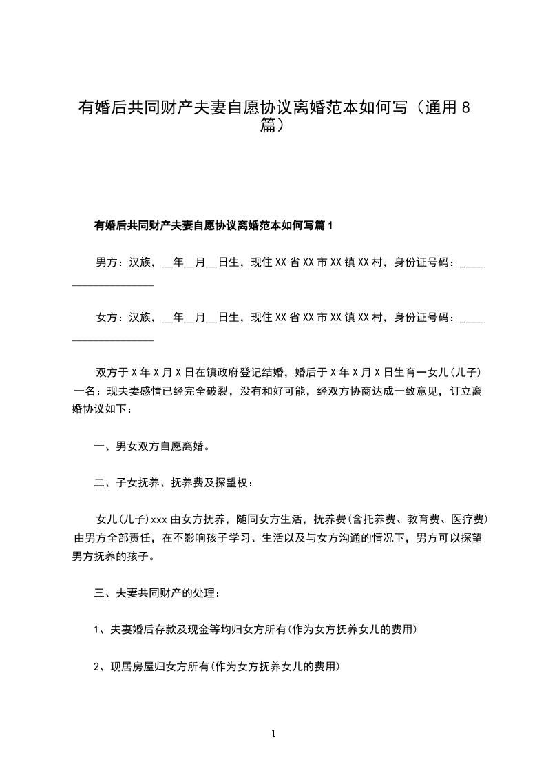 有婚后共同财产夫妻自愿协议离婚范本如何写篇8