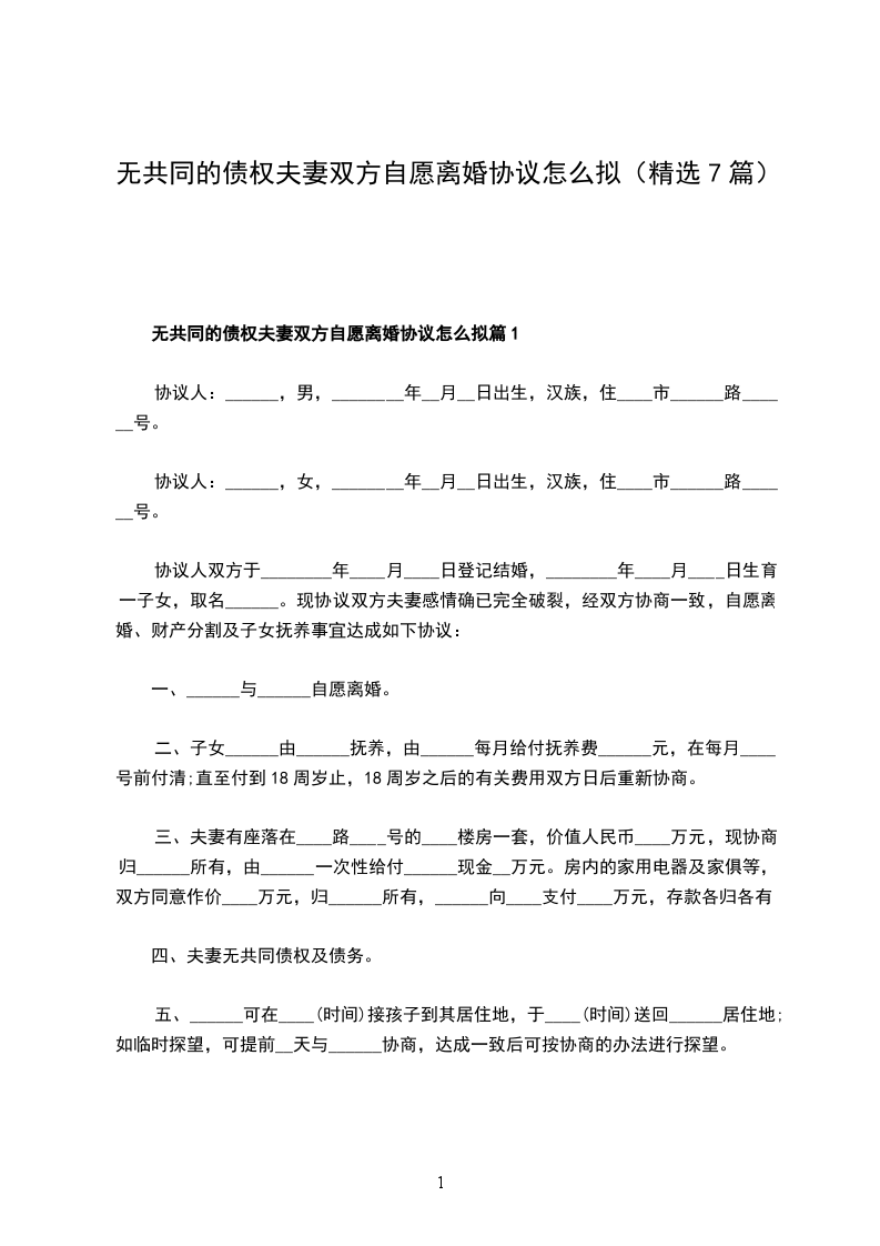 无共同的债权夫妻双方自愿离婚协议怎么拟篇5