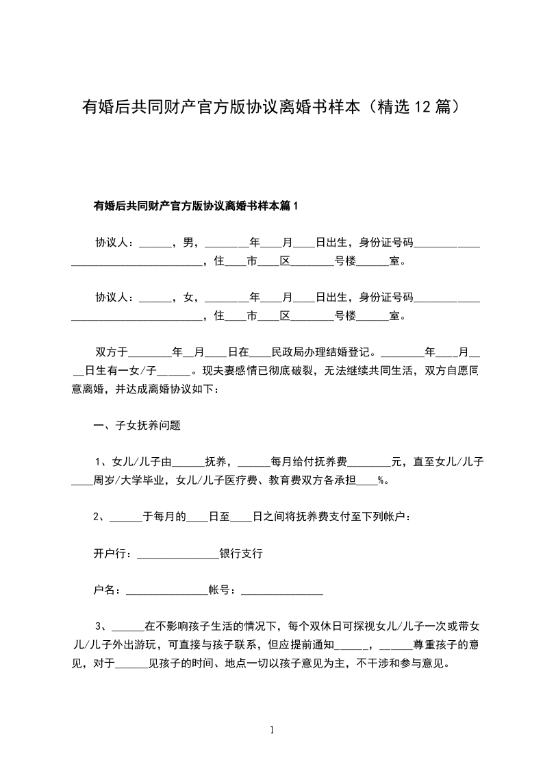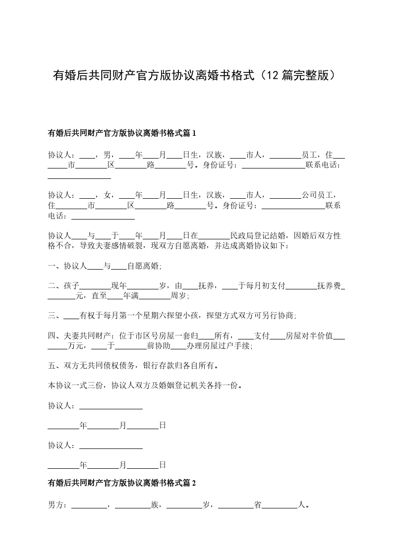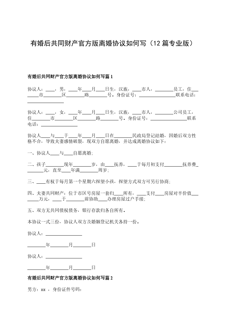 有婚后共同财产官方版离婚协议参考样例篇12