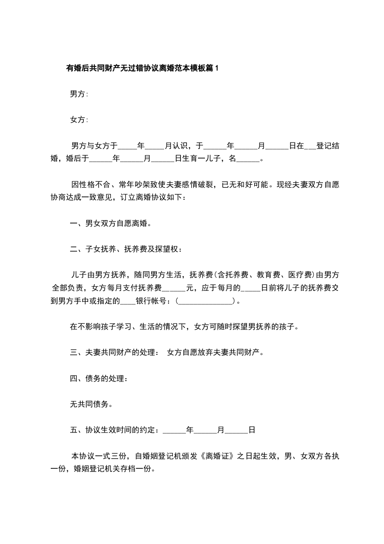 有婚后共同财产无过错协议离婚书参考格式篇2