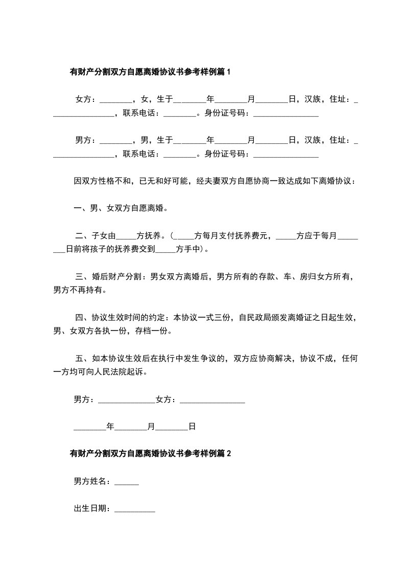 有财产分割双方自愿协议离婚范本参考样例篇2