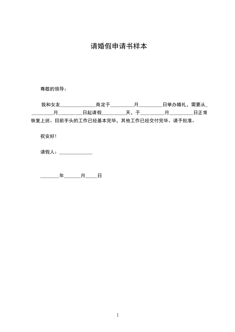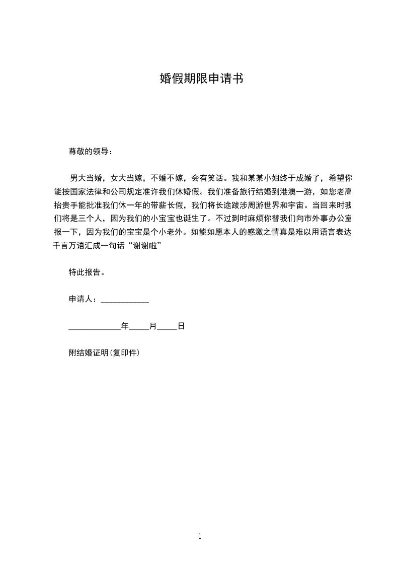 男大当婚,女大当嫁,不婚不嫁,会有笑话。我和某某小姐终于成婚了,希望你能按国家法律和公司规定准许我们休婚假。我们准备旅行结婚到港澳一游,如您老高抬贵手能批准我们休一年的带薪长假,我们将长途跋涉周游世界和宇宙。当回来时我们将是三个人,因为我们的小宝宝也诞生了。不过到时麻烦你替我们向市外事办公室报一下,因为我们的宝宝是个小老外。如能如愿本人的感激之情真是难以用语言表达,千言万语汇成一句话“谢谢啦”