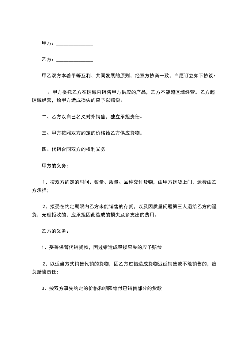 一、甲方委托乙方在区域内销售甲方供应的产品,乙方不能超区域经营。乙方超区域经营,给甲方造成损失的应予以赔偿。