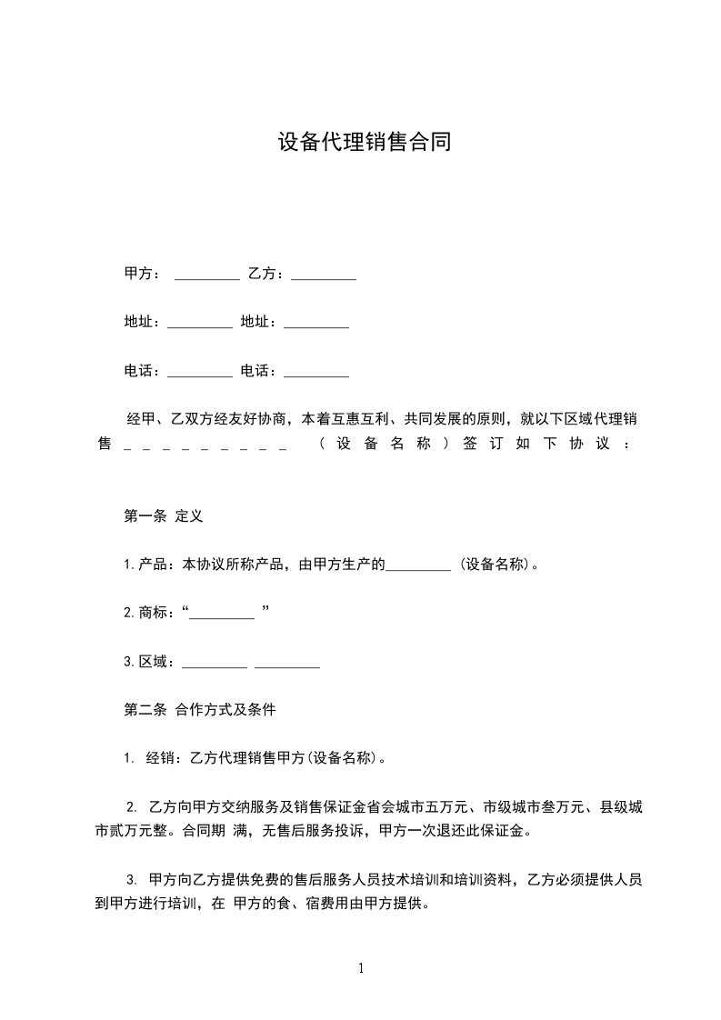 _____________________是____________________________中国地区________________经销总代理商,现因市场发展需要,经甲乙双方协商一致,甲方同意授权乙方作为甲方____________地区(省级、地级、县级)该产品的唯一代理商,销售地域为____________范围内。并约定以下条款互相遵守: