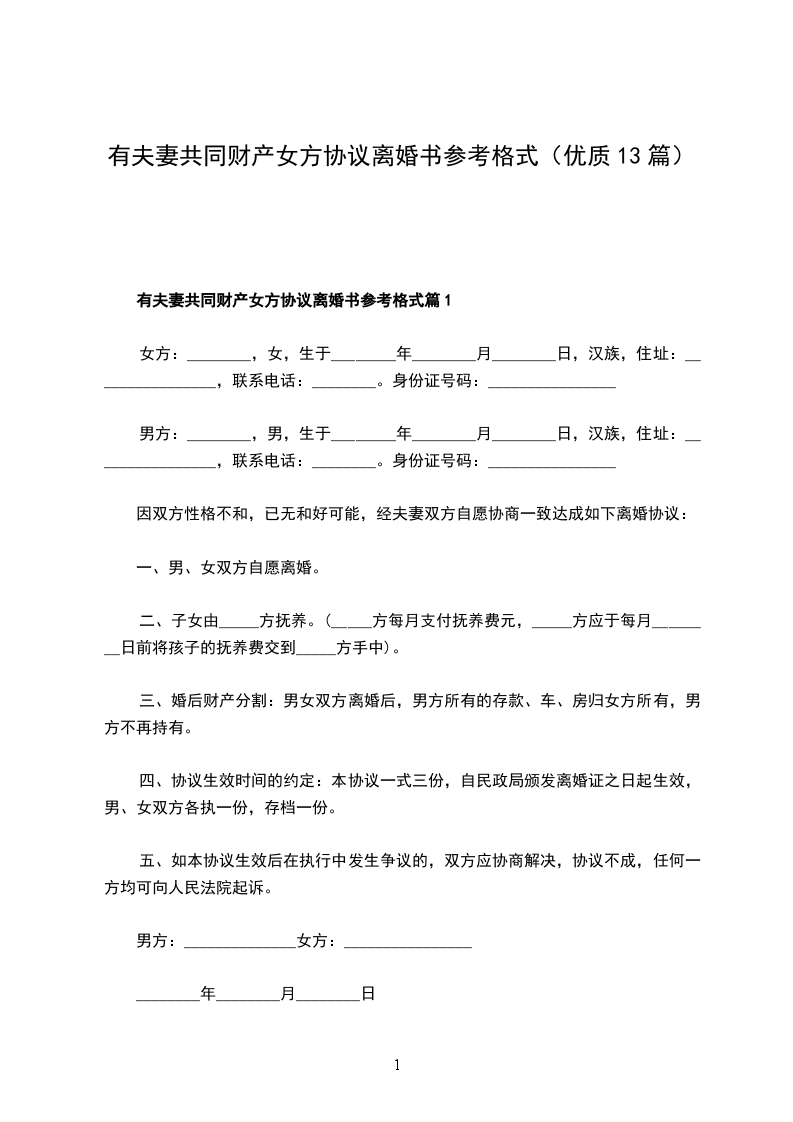 有夫妻共同财产女方协议离婚书参考格式篇13