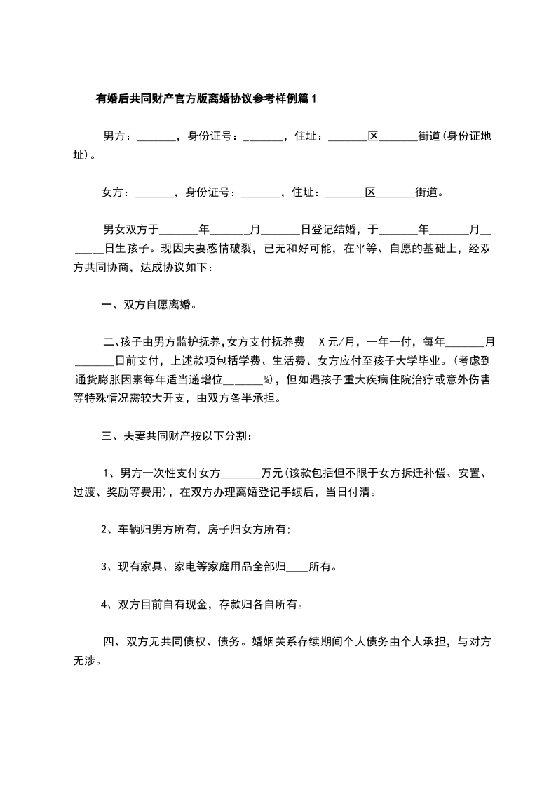 有婚后共同财产官方版离婚协议参考样例篇10