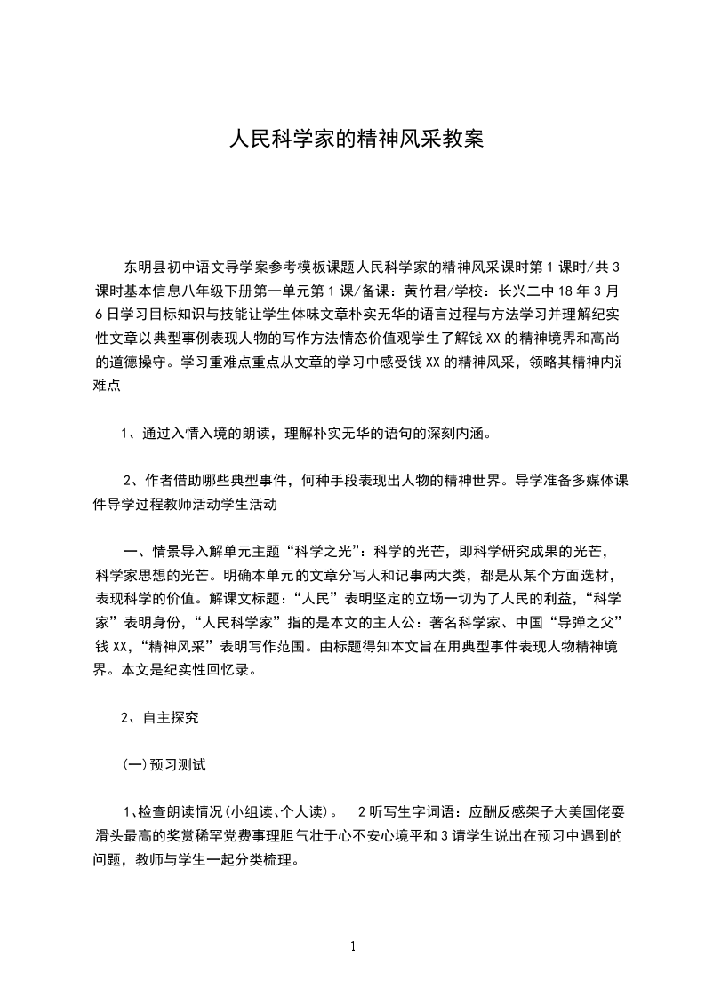 东明县初中语文导学案参考模板课题人民科学家的精神风采课时第1课时/共3课时基本信息八年级下册第一单元第1课/备课:黄竹君/学校:长兴二中18年3月6日学习目标知识与技能让学生体味文章朴实无华的语言过程与方法学习并理解纪实性文章以典型事例表现人物的写作方法情态价值观学生了解钱XX的精神境界和高尚的道德操守。学习重难点重点从文章的学习中感受钱XX的精神风采,领略其精神内涵。难点