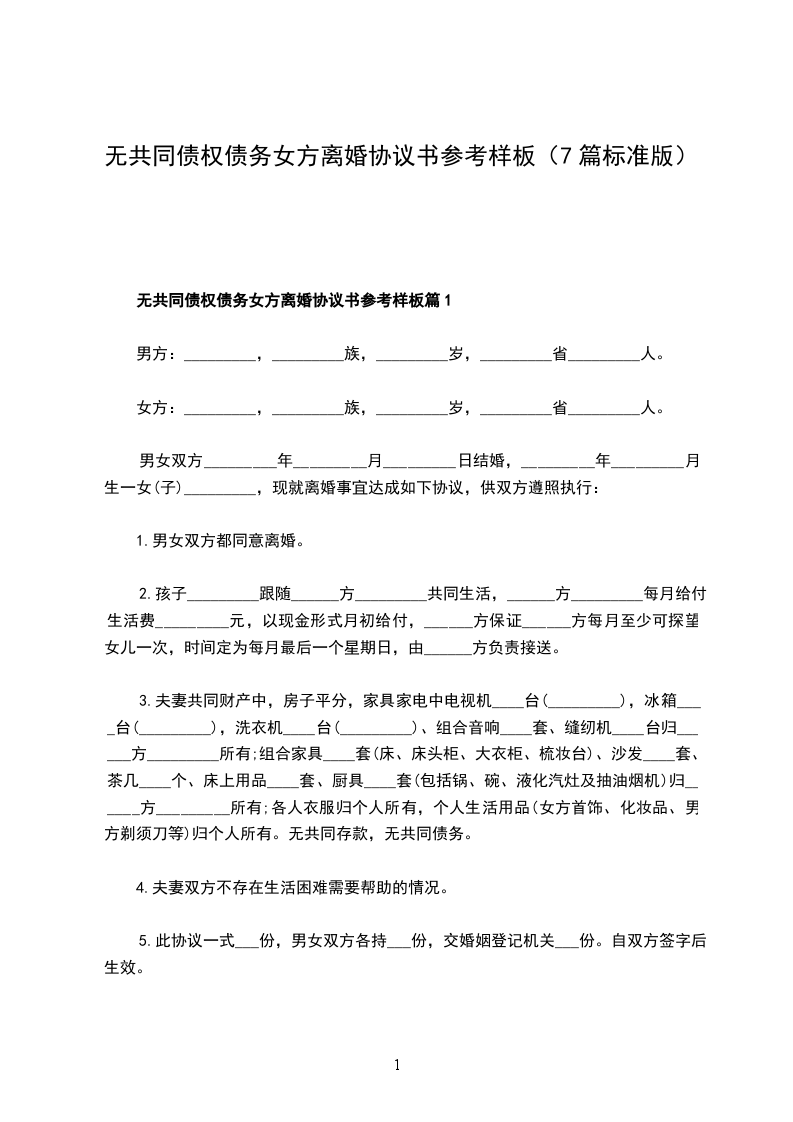 无共同债权债务女方离婚协议书参考样板篇7