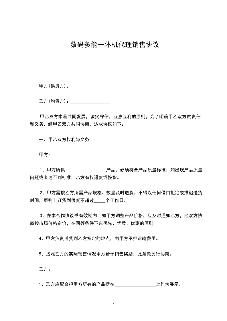 数码多能一体机代理销售协议