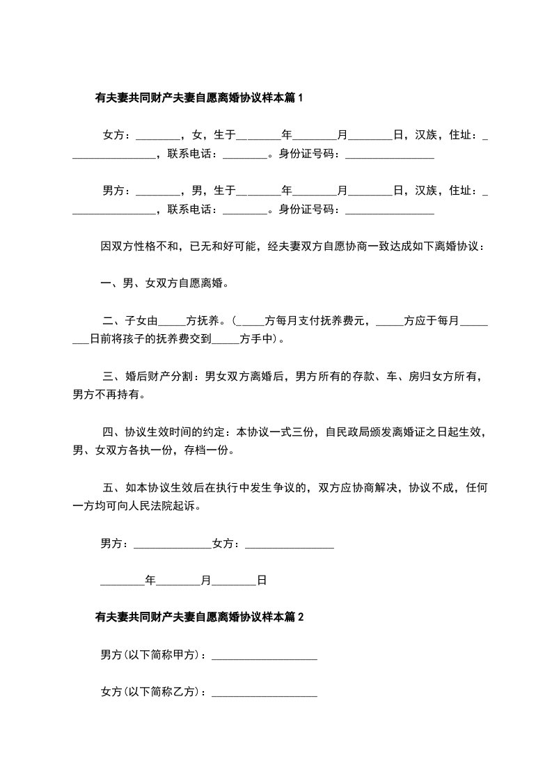 有夫妻共同财产夫妻自愿离婚协议书模板篇2