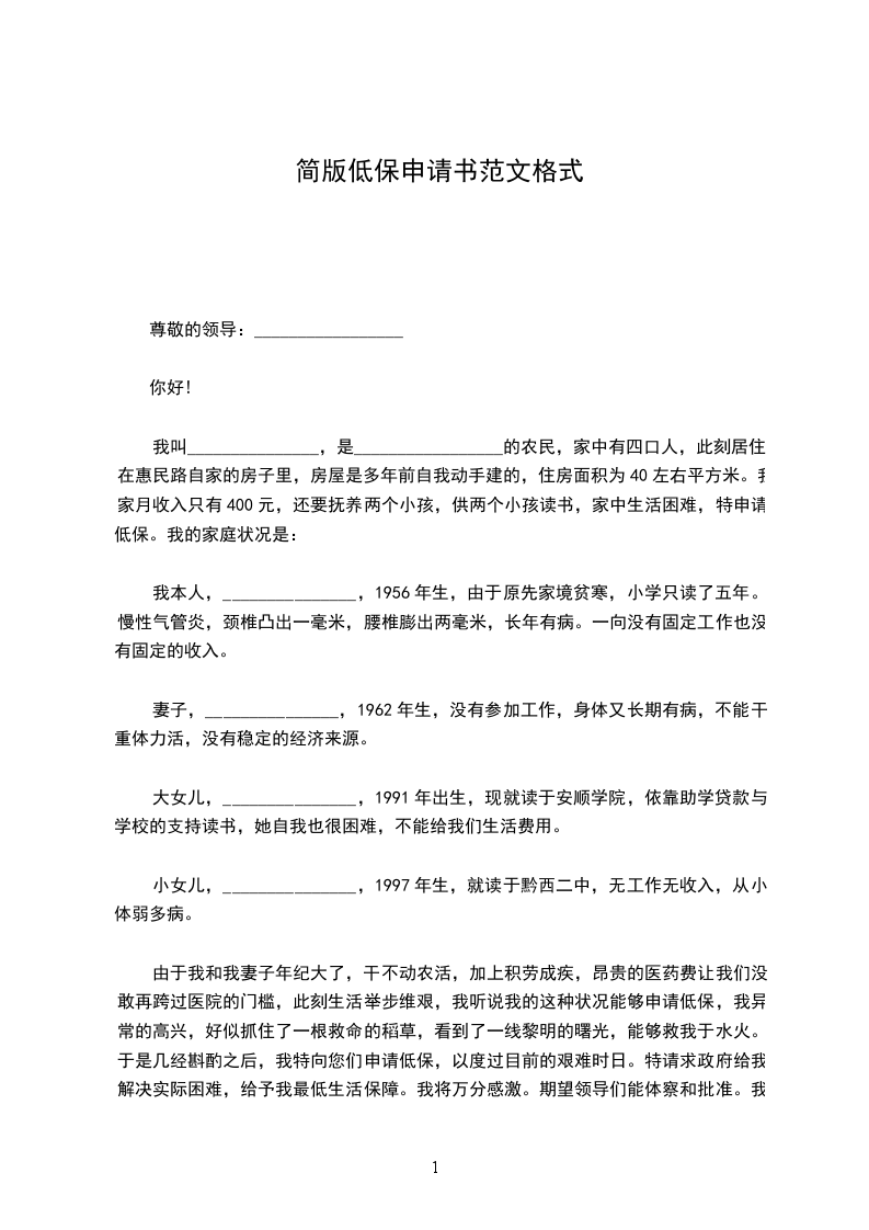 我叫_______________,是_________________的农民,家中有四口人,此刻居住在惠民路自家的房子里,房屋是多年前自我动手建的,住房面积为40左右平方米。我家月收入只有400元,还要抚养两个小孩,供两个小孩读书,家中生活困难,特申请低保。我的家庭状况是:
