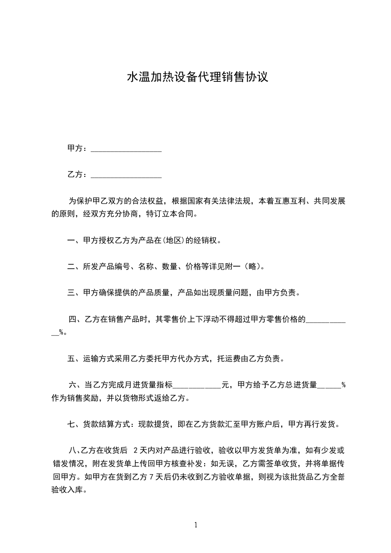 六、当乙方完成月进货量指标____________元,甲方给予乙方总进货量______%作为销售奖励,并以货物形式返给乙方。