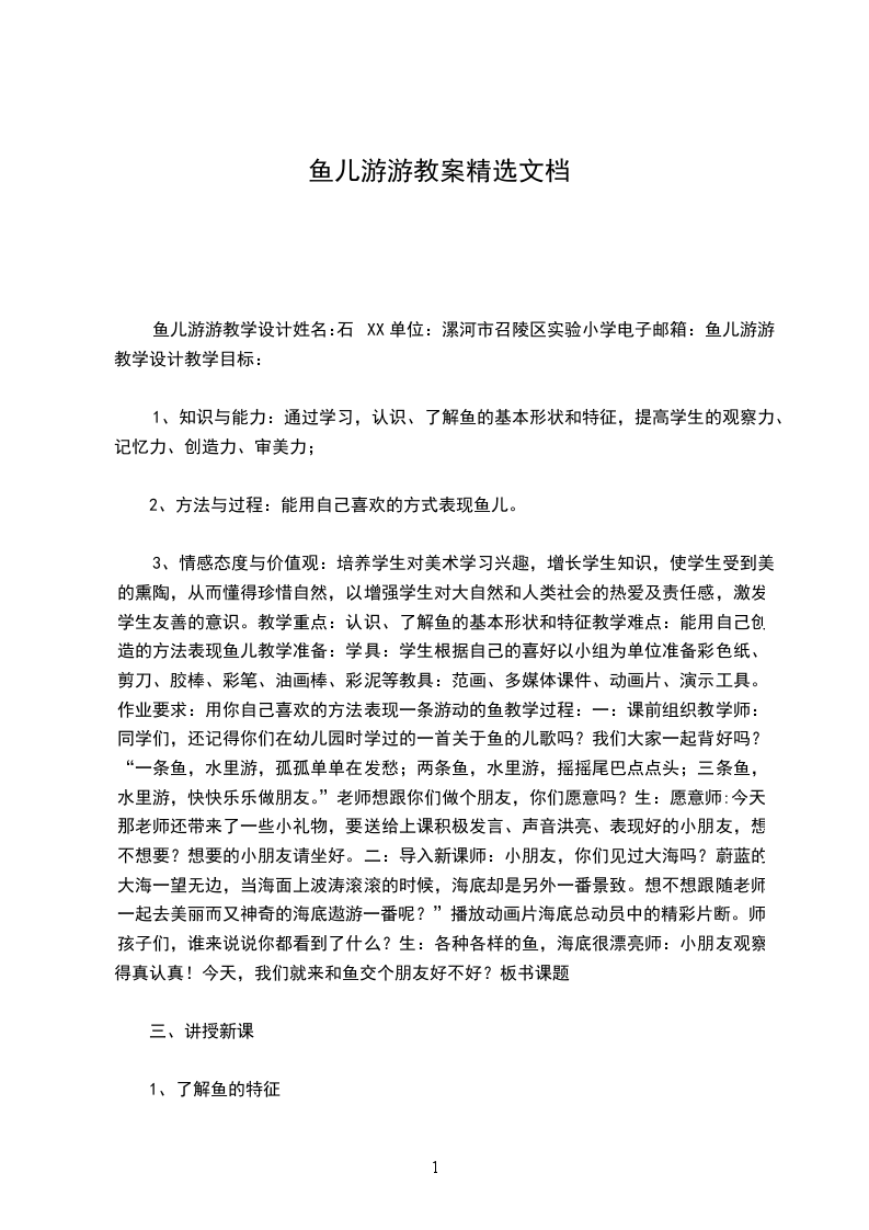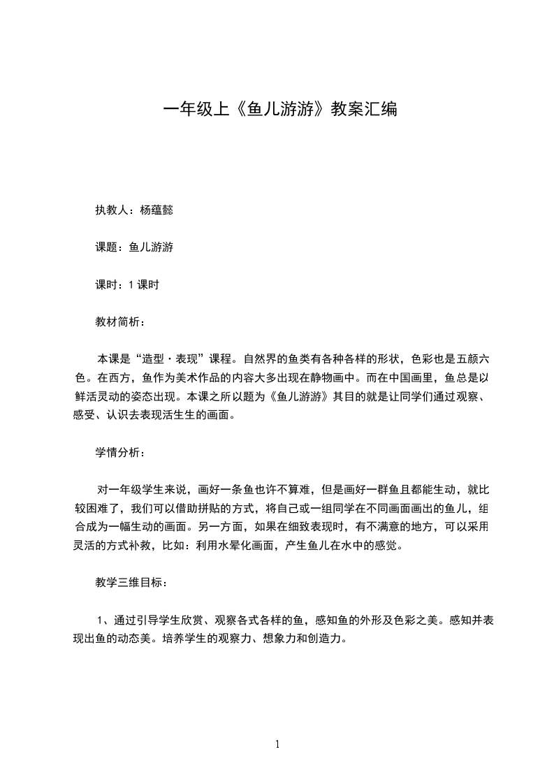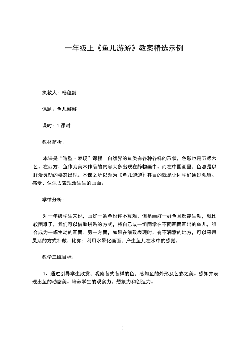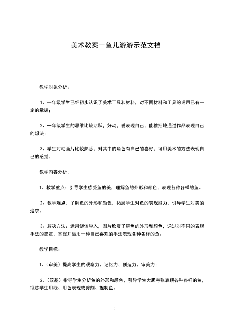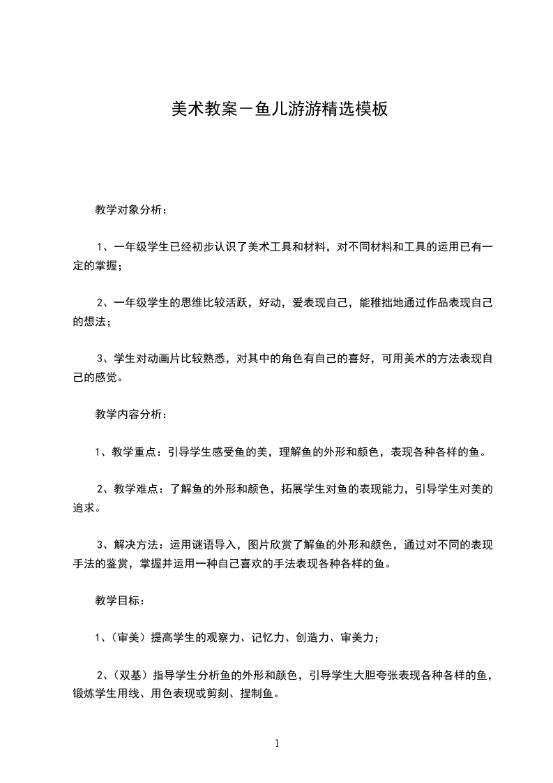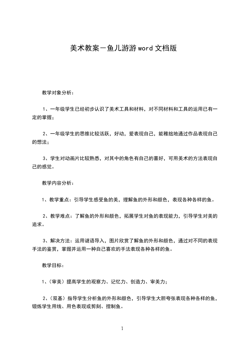 一、学情分析:一年级学生已经初步认识了美术工具和材料,对不同的材料和工具的使用已有一定的掌握,会用简单的线条和色块来表现他们所知道的东西。现在的孩子以独生子女居多,他们接受信息的途径很广,思维活跃、想象丰富、XXX,他们以自我为中心,喜欢按照自己的想法自由的表现画面;好奇心重,爱表现自己,但动手能力较差,只能用简单的工具和绘画材料来稚拙地表现自己的想法。而鱼儿游游这节课就是让他们在轻松愉悦的氛围中无拘无束地表现自己的想法,符合学生发展的特点。