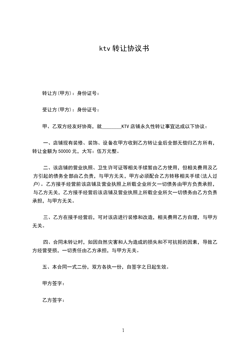 一、店铺现有装修、装饰、设备在甲方收到乙方转让金后全部无偿归乙方所有,转让金额为50000元,大写:伍万元整。